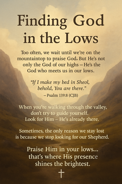 Too often, we wait until we’re on the mountaintop to start praising God — when things are finally looking up, when the storm has passed, when the weight feels lighter. But the truth is, we need to seek and praise God in our lows, not just our highs.