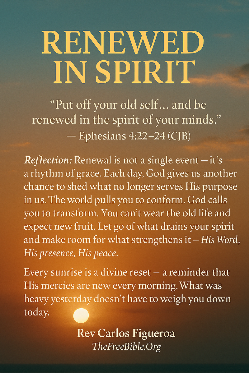 To be renewed in spirit means to surrender yesterday’s mindset — the pride, the doubt, the bitterness — and to clothe yourself in His truth. Like changing a garment, you must take off the old before putting on the new. You can’t walk in freedom while still wearing chains of the past.